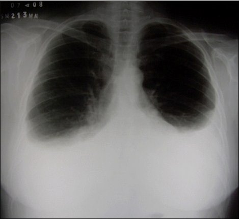 Em maio de 2007, procurou atendimento médico por causa de dispnéia. Na época, a radiografia de tórax evidenciou derrame pleural bilateral e o ecocardiograma realizado não mostrou alterações. Novamente, a paciente não prosseguiu com acompanhamento médico. Agora, em função da piora da dispnéia, apesar do uso de diuréticos e inibidores da enzima conversora de angiotensina (IECA) durante uma semana, foi submetida à internação para investigação diagnóstica.
