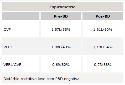 HMA: Paciente vem à consulta com queixa de dispnéia há cinco anos, iniciada aos grandes esforços (subir uma ladeira) e hoje observada ao realizar caminhadas no plano, mas com alguns episódios também ao tomar banho e ao repouso. Queixa-se de tosse produtiva episódica, com expectoração mucóide e eventualmente purulenta, há mais ou menos 40 anos, ocasião em que recebeu o diagnóstico de bronquiectasia, porém sem segmento clínico adequado. Surgiu, na mesma época da tosse, edema de membros inferiores, que reduz com o uso de diuréticos, porém sem desaparecer. Refere ainda episódios freqüentes de sinusite, com cefaléia frontal e secreção purulenta nasal. Nega dor torácica, sibilância, hemoptóicos ou febre. Não há emagrecimento, adinamia ou outros sintomas.